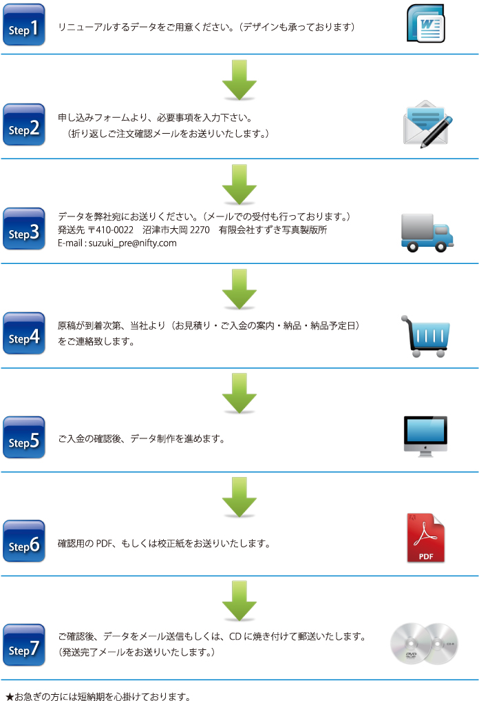・お客様の作られたデータを弊社宛にメール又は、郵送して下さい。